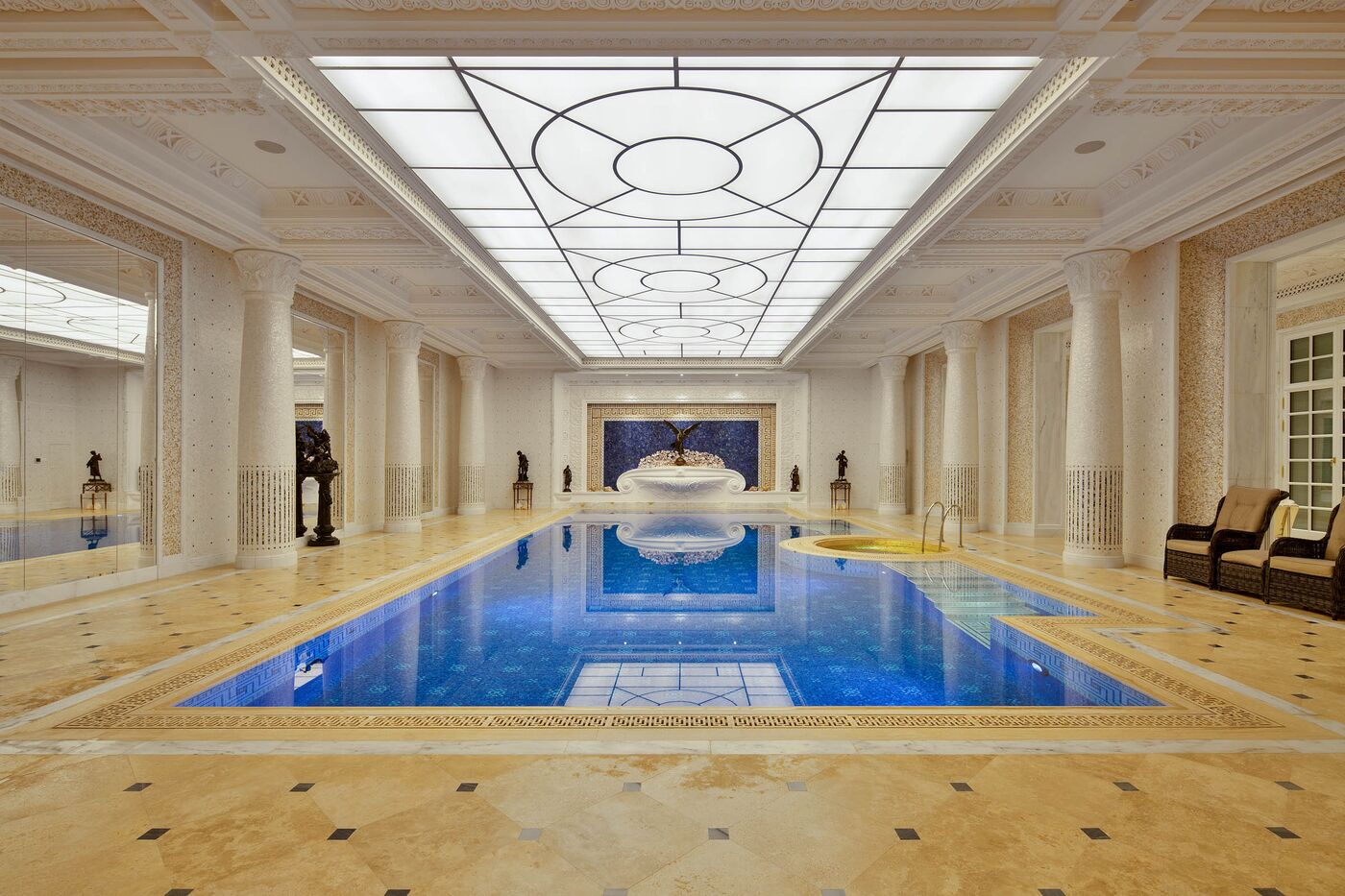 The home in the desirable Emirates Hills neighborhood has 60,000 square feet of indoor space though only five bedrooms: At 4,000 square feet, the primary bedroom is bigger than most homes. The ground floor has rooms for dining and entertaining. Other amenities include a 15-car garage, 19 bathrooms, indoor and outdoor pools, two domes, an 80,000-liter (21,000-gallon) coral reef aquarium, a power substation and panic rooms. It sits on a 70,000-square-foot lot in a gated community overlooking a golf course.